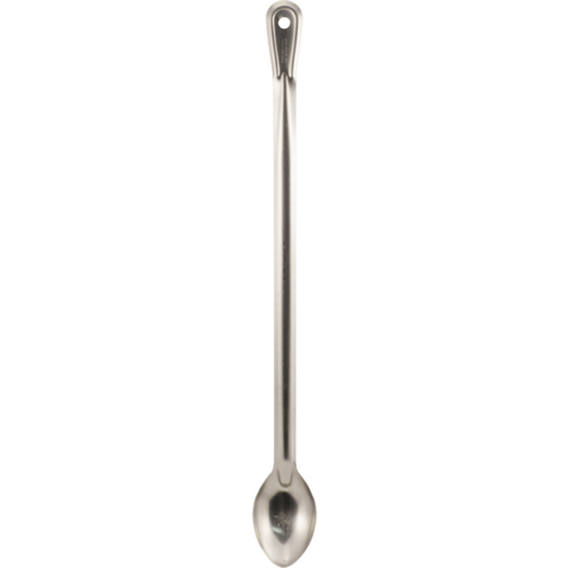 24" long stainless-steel spoon, great for stirring boiling liquids, mixing in hops, etc. Features a wide stamped handle, and a hang hole at the end.